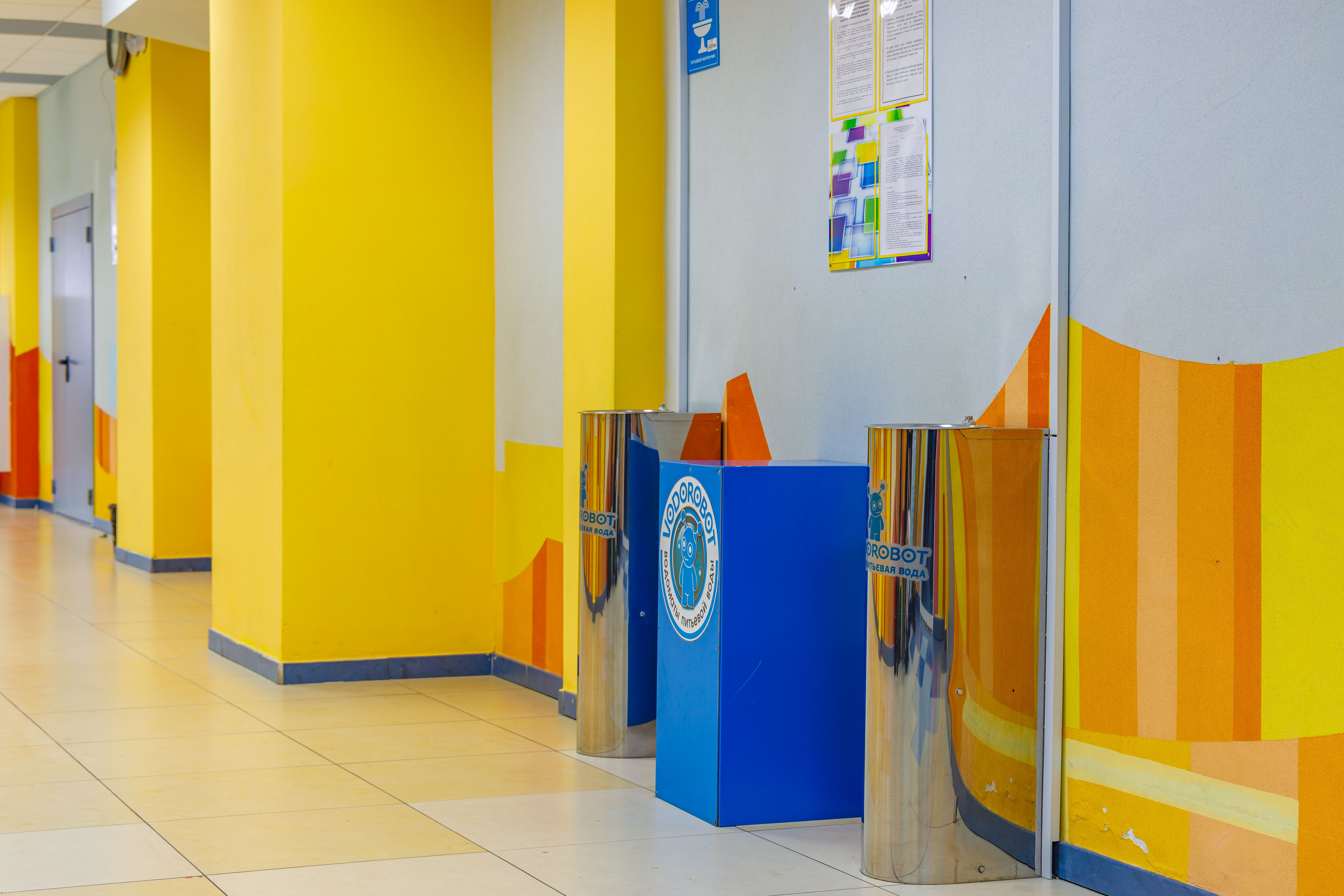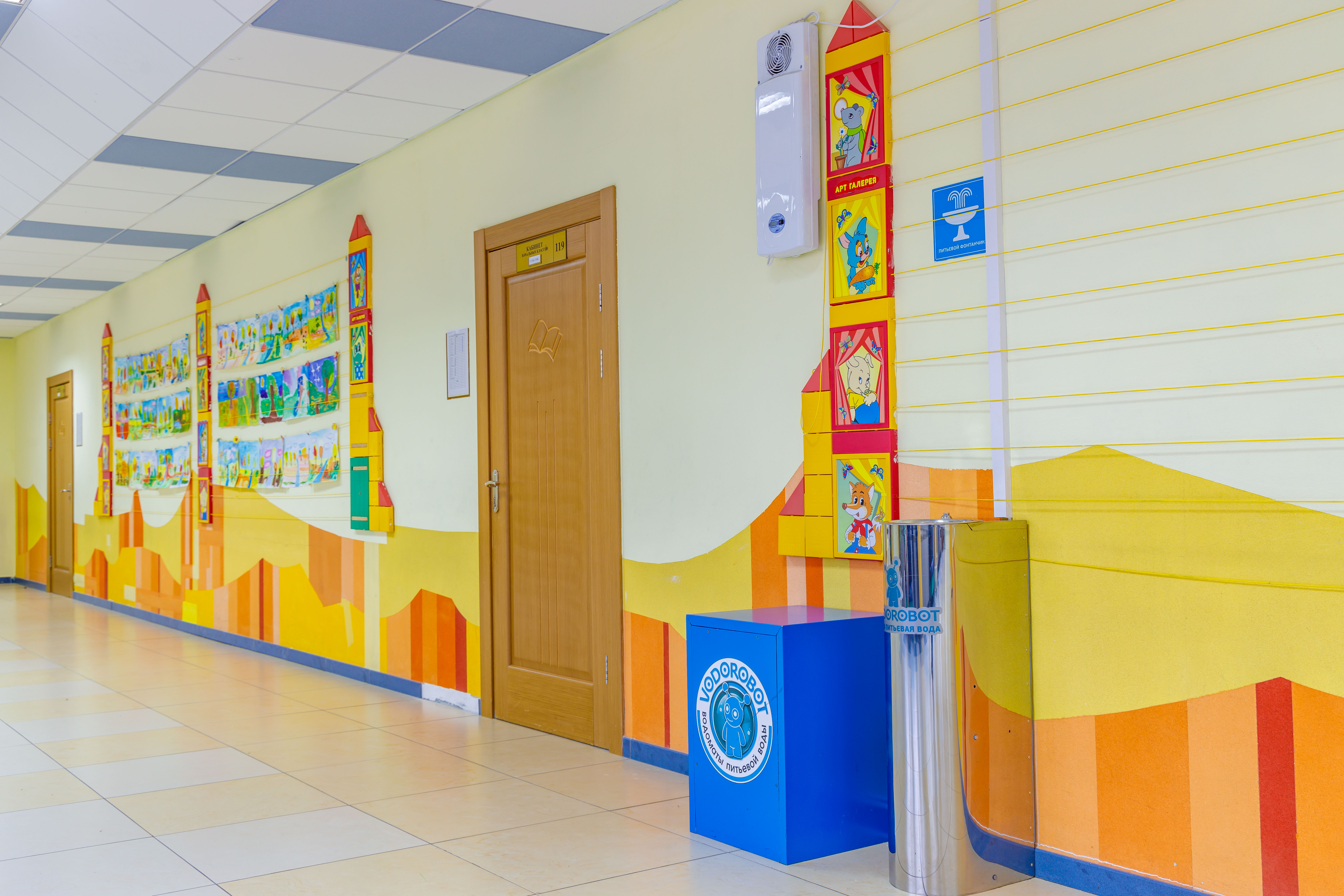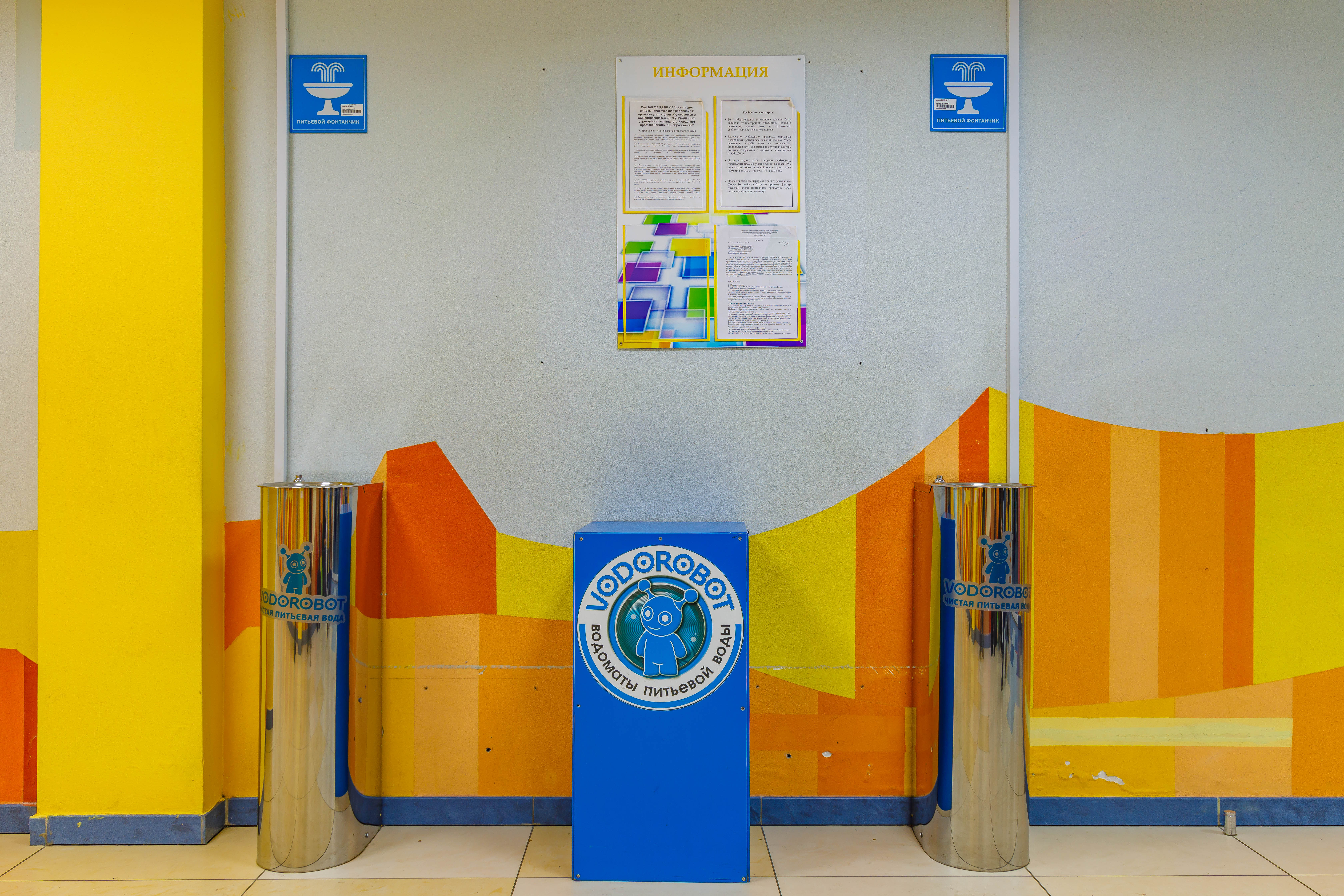 Оборудование обеспечивает непрерывное потребление чистой воды на переменах (не менее 40 минут). Элементы коммуникаций проведены максимально незаметно. Системы водоподготовки размещаются в закрытых корпусах, которые оформлены в стиле учреждения. Питьевые фонтаны оснащены ограничительным кольцом и специальной
